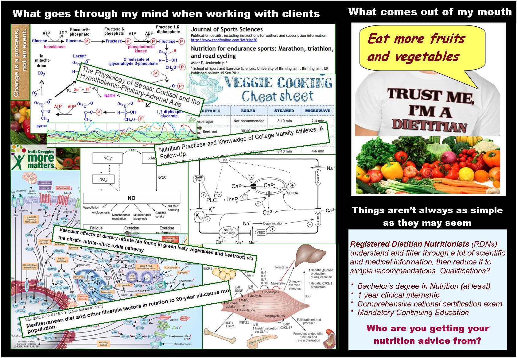 RDNs understand the science behind nutrition recommendations. There are many self-proclaimed “nutritionists” – countless journalists, doctors, and fitness professionals claiming to be nutrition experts and dishing out all kinds of opinions and pseudoscience. Some have certificates from courses and programs they have completed on line (typically completed in a few sessions or a few months… and taught by individuals with no formal nutrition training). Others have degrees in medicine, physics, or journalism. After all, how complicated can it be to understand nutrition?